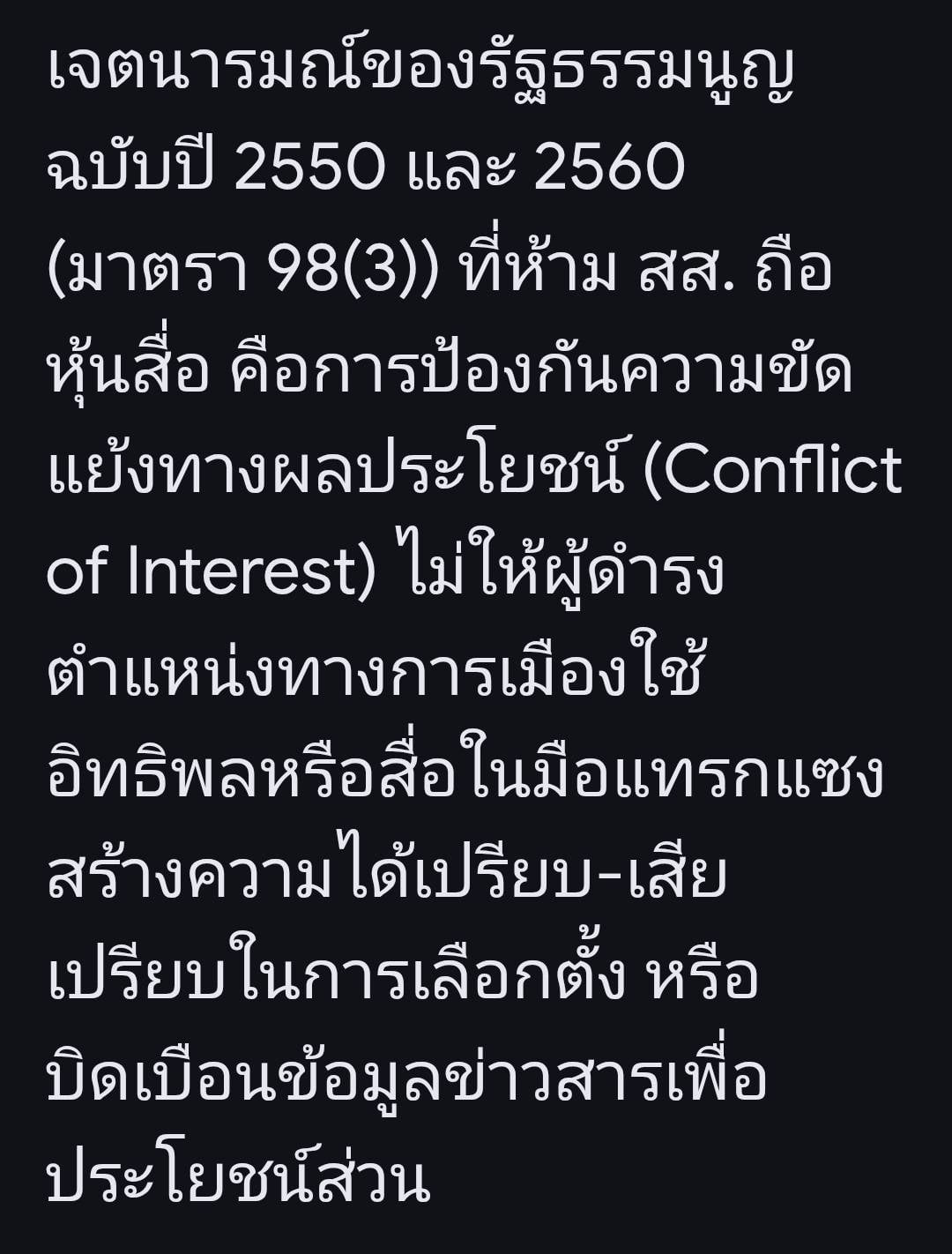 1. เจตนารมณ์ของรธน. คือ ไม่ต้องการให้สส. และพรรคการเมืองเป็นเจ้าของ ครอบงำ และ บงการสื่อใดสื่อหนึ่งได้ เพราะถ้าสส.และพรรคเป็นเจ้าของสื่อ ก็จะสามารถใช้สื่อนั้นสื่อสารข้อมูลของสส.และพรรคในทางสนับสนุน หรือ โต้ตอบได้ จึงตรากฎหมายว่า ห้ามสส.ถือหุ้นสื่อ
