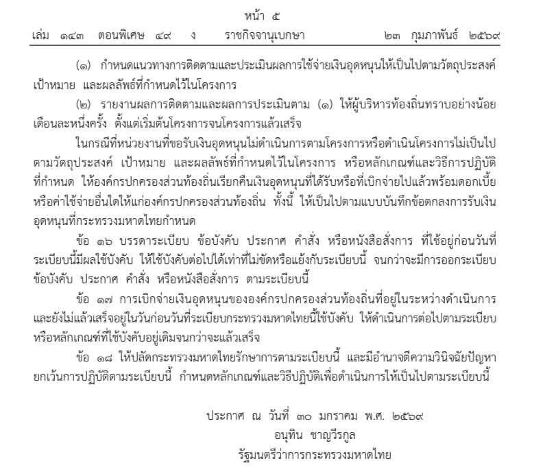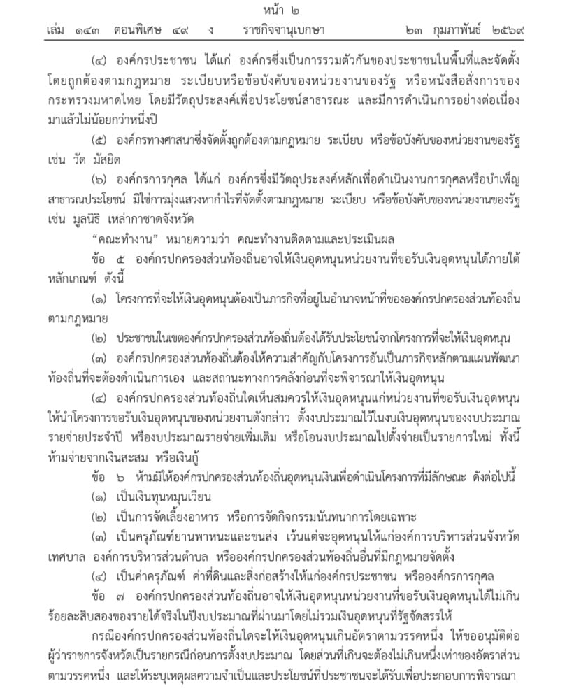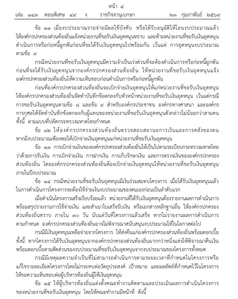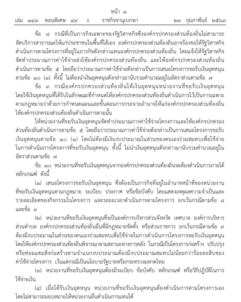 24 กุมภาพันธ์ 2569 - เว็บไซต์ราชกิจจานุเบกษา เผยแพร่ ระเบียบกระทรวงมหาดไทย ว่าด้วยเงินอุดหนุนขององค์กรปกครองส่วนท้องถิ่น พ.ศ. ๒๕๖๙