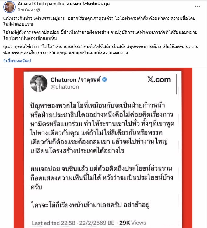 24 กุมภาพันธ์ 2569 - นางอมรัตน์ โชคปมิตต์กุล อดีต สส.บัญชีรายชื่อ พรรคก้าวไกล โพสต์เฟซบุ๊กกล่าวถึงนายจาตุรนต์ ฉายแสง แกนนำพรรคเพื่อไทยว่า แก่เพราะกินข้าว เฒ่าเพราะอยู่นาน อยากเรียนคุณจาตุรนต์ว่า ไอโอทำตามคำสั่ง ด้อมทำตามความเชื่อโดยไม่มีค่าตอบแทน