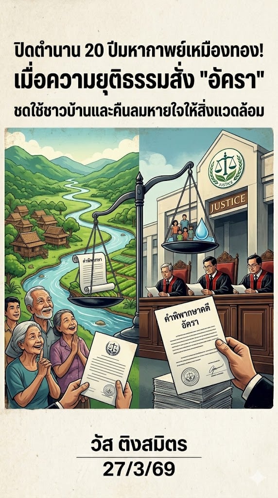 27 มี.ค. 2569 - นายวัส ติงสมิตร นักวิชาการอิสระ และอดีตผู้พิพากษาอาวุโสในศาลฎีกา โพสต์เฟซบุ๊กในหัวข้อ ปิดตำนาน 20 ปีมหากาพย์เหมืองทอง! เมื่อความยุติธรรมสั่ง "อัครา" ชดใช้ชาวบ้านและคืนลมหายใจให้สิ่งแวดล้อม มีเนื้อหาดังนี้