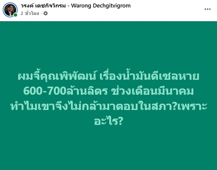 11 เมษายน 2569 - นพ.วรงค์ เดชกิจวิกรม สส.บัญชีรายชื่อ และหัวหน้าพรรคไทยภักดี โพสต์เฟซบุ๊กว่าผมจี้คุณพิพัฒน์ เรื่องน้ำมันดีเซลหาย 600-700ล้านลิตร ช่วงเดือนมีนาคม