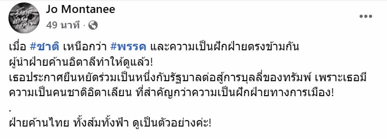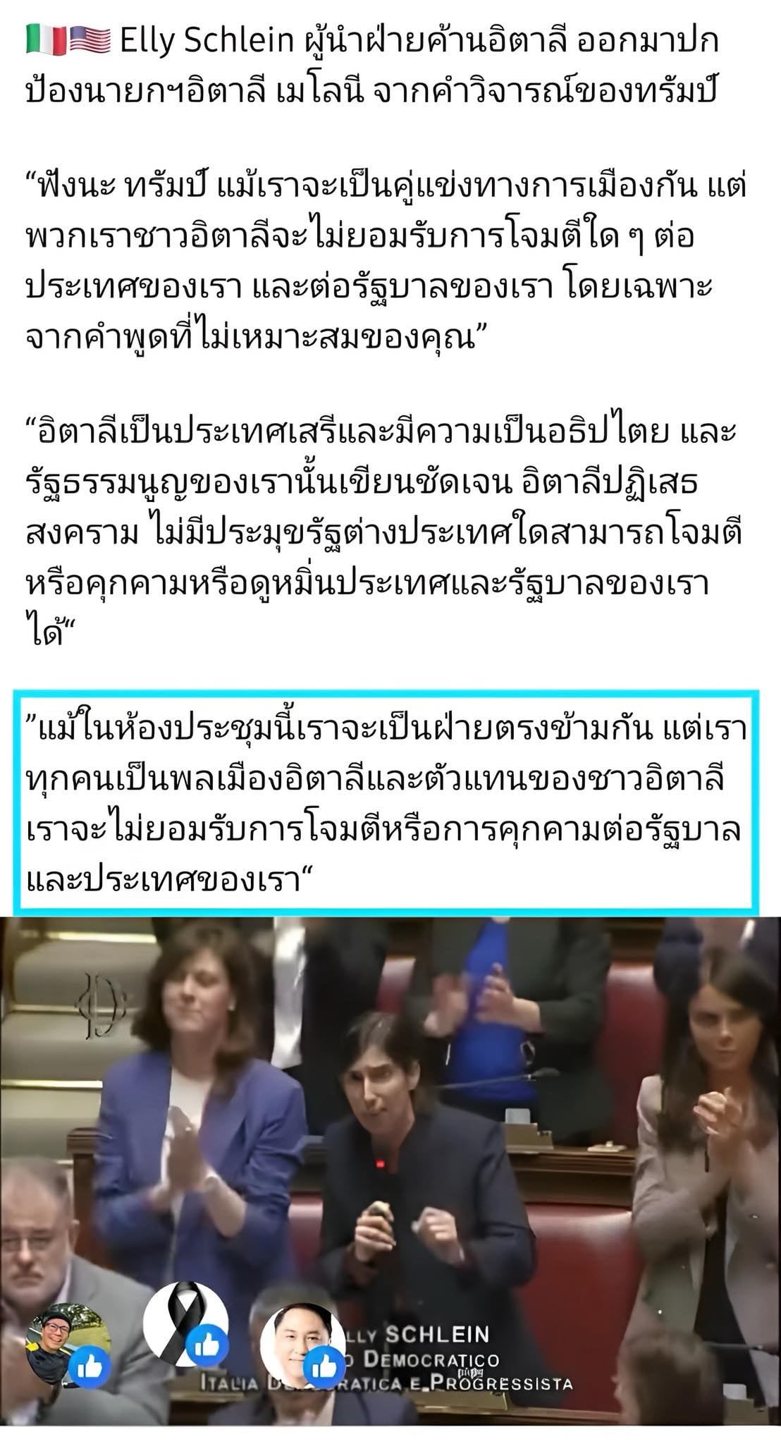 เธอประกาศยืนหยัดร่วมเป็นหนึ่งกับรัฐบาลต่อสู้การบูลลี่ของทรัมป์ เพราะเธอมีความเป็นคนชาติอิตาเลียน ที่สำคัญกว่าความเป็นฝักฝ่ายทางการเมือง!