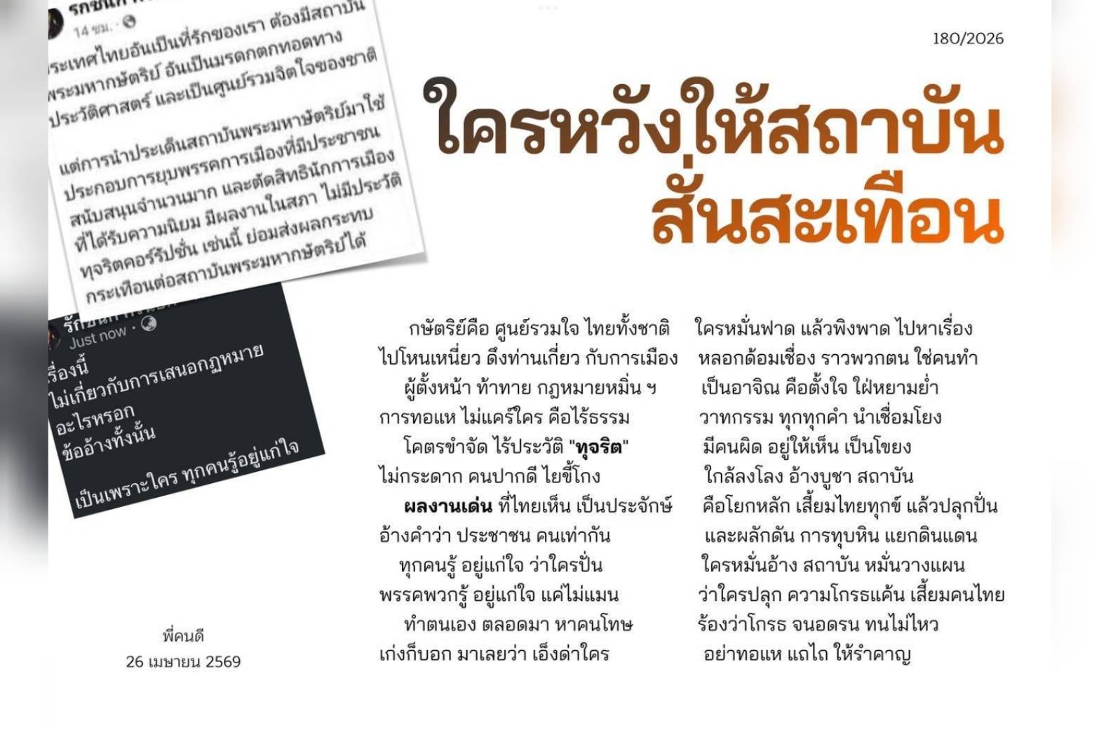 26 เม.ย.2569-เพจP.khondee ( พี่คนดี กวีสมัครเล่น) ร่ายกลอนเรื่อง “ใครหวังให้สถาบันสั่นสะเทือน” เนื้อหาระบุ