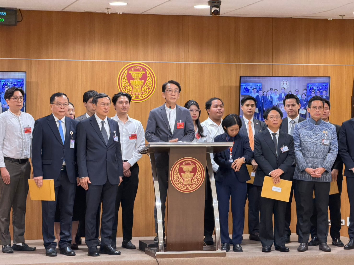 29 เม.ย.2569 - ที่รัฐสภา ตัวแทน 5 พรรคการเมือง ประกอบด้วย นายกรวีร์ ปริศนานันกุล สส. อ่างทอง พรรคภูมิใจไทย นายพริษฐ์ วัชรสินธุ สส. บัญชีรายชื่อ พรรคประชาชน นายจตุรนต์ฉายแสง สส. บัญชีรายชื่อ พรรคเพื่อไทย นายอรรถกร ศิริลัทยากร สส.พรรคกล้าธรรม และนายสาทิตย์ วงศ์หนองเตย สส.บัญชีรายชื่อ พรรคประชาธิปัตย์ รับหนังสือจากนายปริญญา เทวานฤมิตรกุล อาจารย์ประจำคณะนิติศาสตร์ มหาวิทยาลัยธรรมศาสตร์เรื่องขอเสนอแก้ไขกฎหมายยกเลิกการกักขังแทนค่าปรับและการแก้ไขพระราชบัญญัติประกอบรัฐธรรมนูญว่าด้วยการเลือกตั้ง สส.